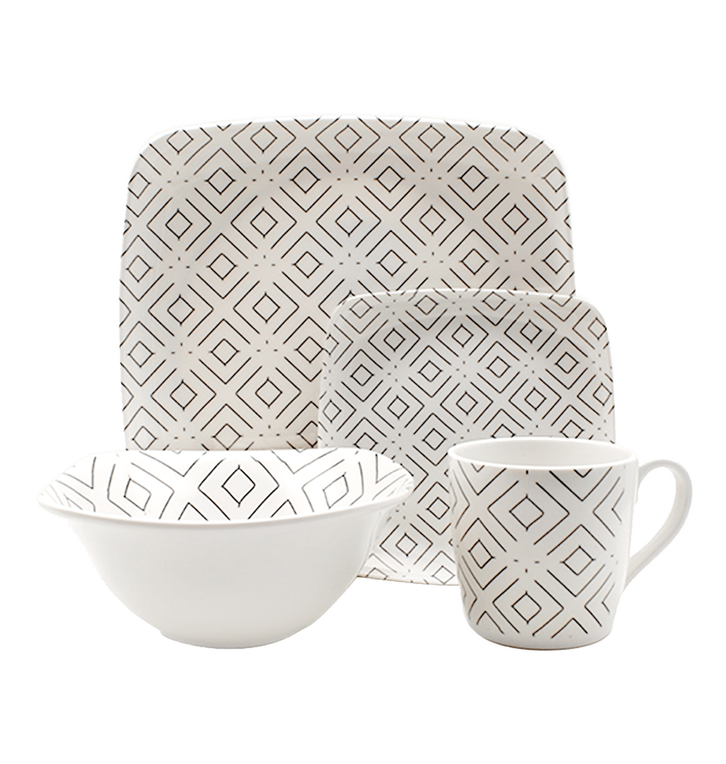 Vajilla en Melamina Primavera Blanca Líneas Cafés Cuadrada Borde 16 Piezas 4 Puestos - Sabana