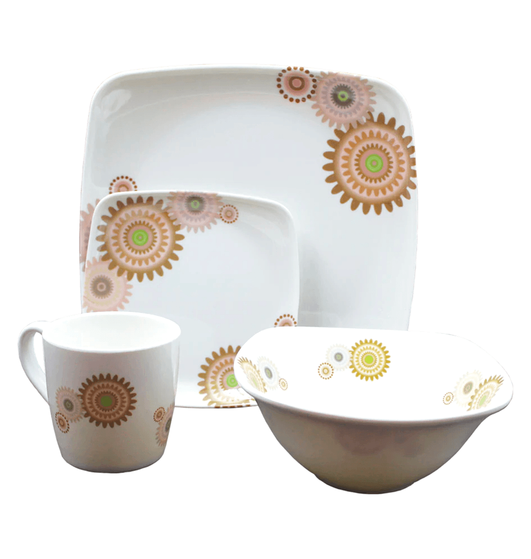 Incluye: 4 platos grandes;4 platos medianos;4 platos soperos;4 pocillos.