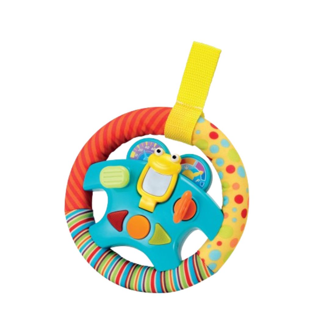 Este divertido Volante de juguete de tela está diseñado para conducir por manos pequeñas y es fácil de sostener. Tiene colores brillantes y una variedad de patrones llamativos que adornan el volante.
